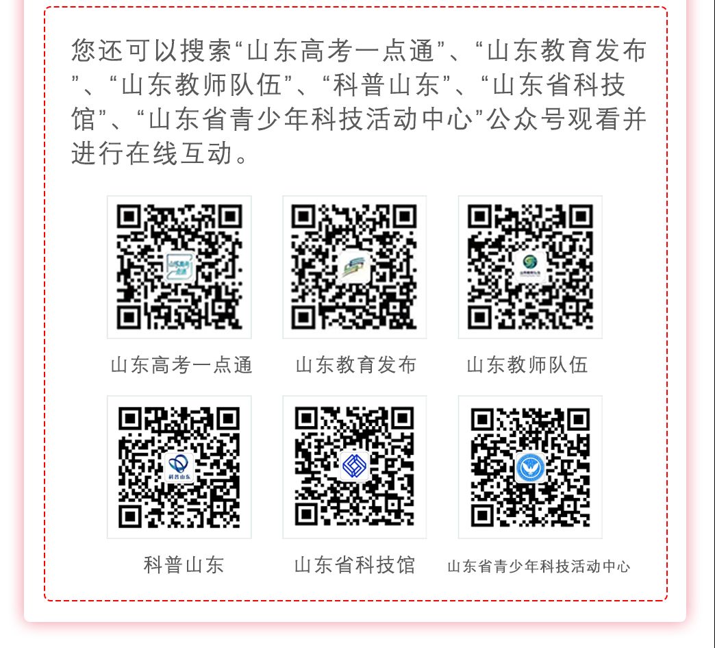 您可以通过“山东教育电视台”、“山东高考一点通”、“山东教育发布”、“山东教师队伍”、“科普山东”、“山东省科技馆”、“山东省青少年科技活动中心”微信公众号进行观看。